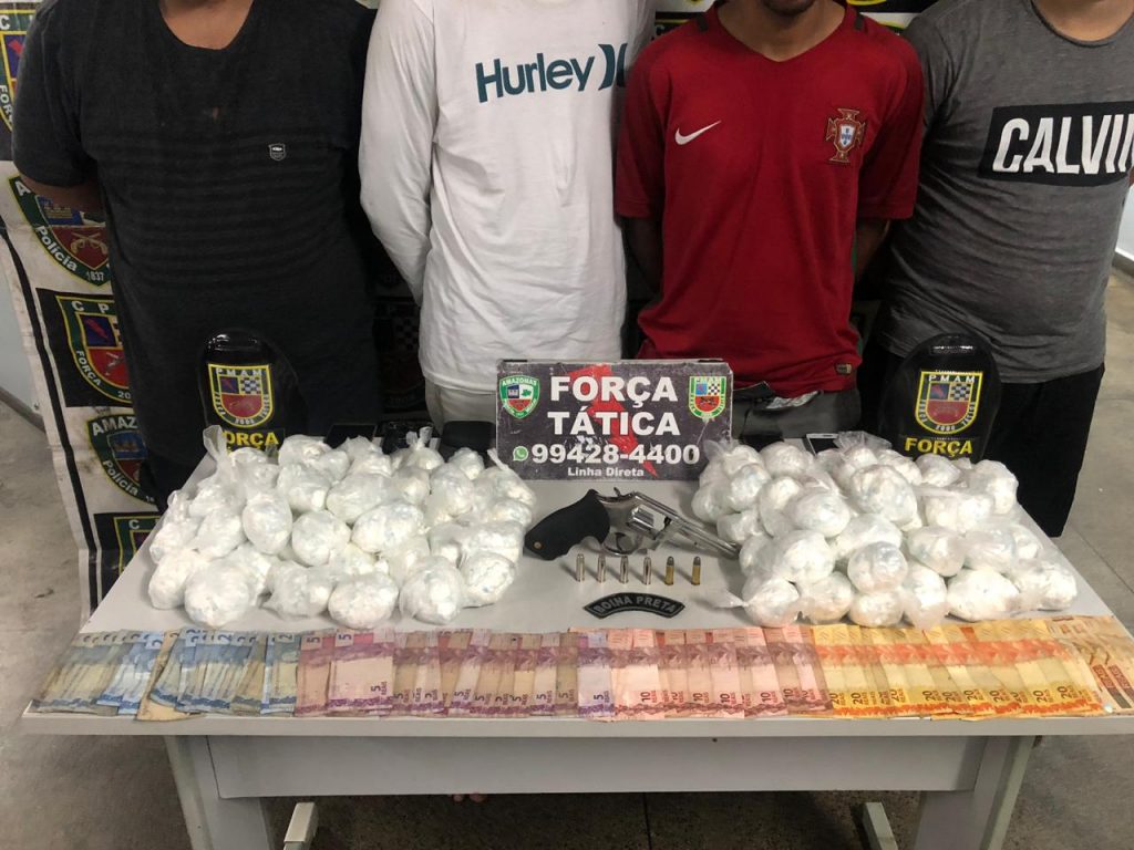 Outro integrante do bando foi preso na rotatória da Suframa, em um carro, com um celular. No veiculo, foram encontradas três sacolas com 4.744 trouxinhas de substância entorpecente, supostamente cocaína. O ultimo suspeito foi preso na rua São Joaquim, bairro Morro da Liberdade, com um revólver de calibre 38 com seis munições não deflagradas e uma bolsa com dois aparelhos celulares. Na casa dele, os militares encontraram uma bolsa com 50 trouxinhas e uma porção pequena de substância entorpecente supostamente cocaína, além de R$ 902 em espécie. O quarteto foi flagranteado no 1º DIP.
