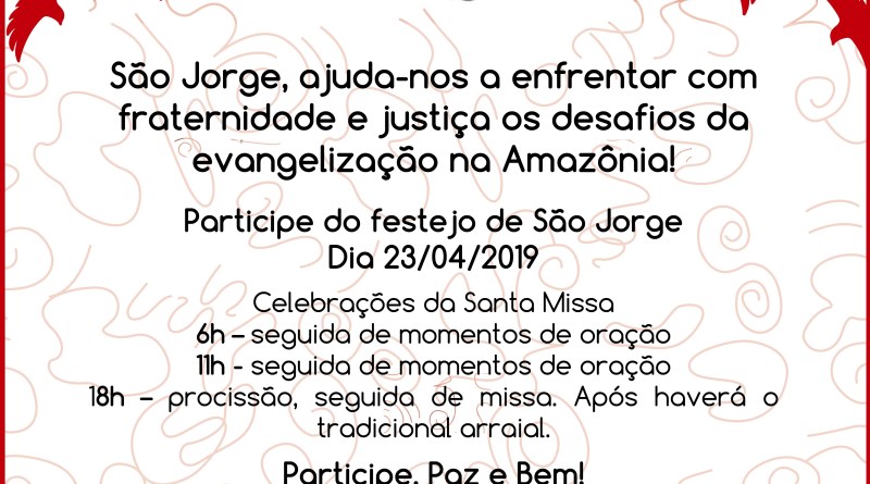 Manaus – AM | Neste dia 23 de abril, a Igreja Católica celebra o Dia de São Jorge, o Santo Guerreiro, e a Paróquia São Jorge, cuja matriz dedicada ao santo está localizada na rua Emílio Ruas, 311, bairro São Jorge, zona Oeste, preparou uma grande programação.