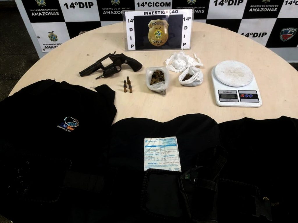 Manaus – AM | Railton Marques de Senna, de 25 anos, conhecido como “Vaca”, foi preso na manhã desta terça-feira (7/5), por volta das 7h, em posse de um revólver calibre 38 com numeração suprimida, cinco munições intactas do mesmo calibre, duas porções de maconha, uma balança de precisão digital e três coletes balísticos.