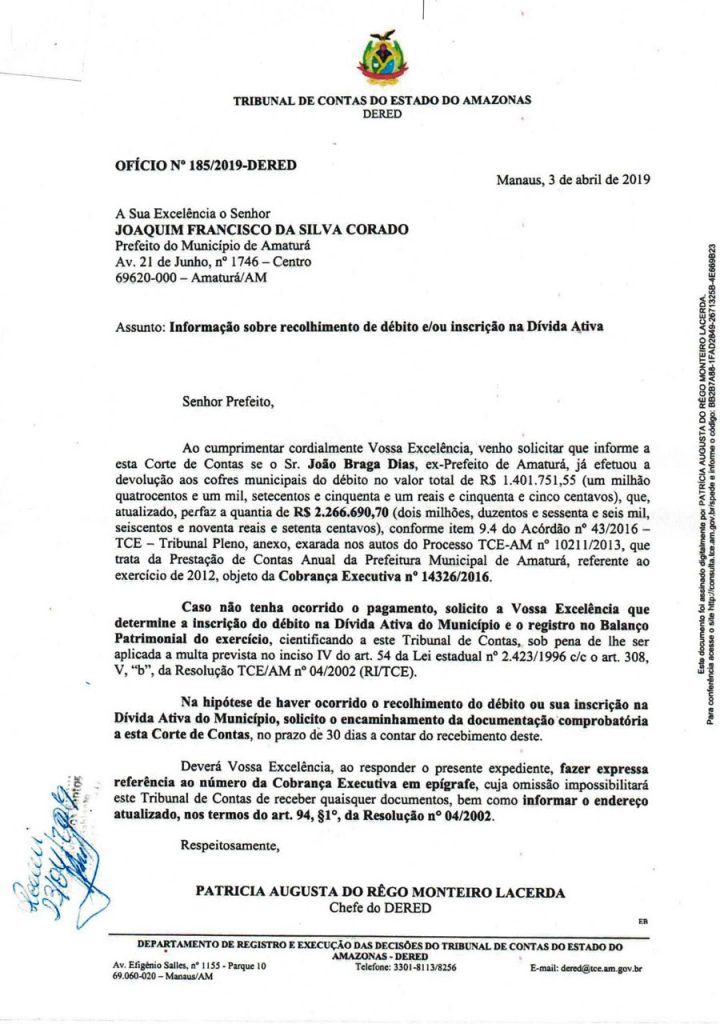 Manaus – AM | João Braga Dias, ex-prefeito de Amaturá, foi condenado a devolver R$ 2.266.690,70 para a Prefeitura município ao ter sua prestação de contas referentes ao exercício de 2012 rejeitadas pelo Tribunal de Contas do Estado (TCE).