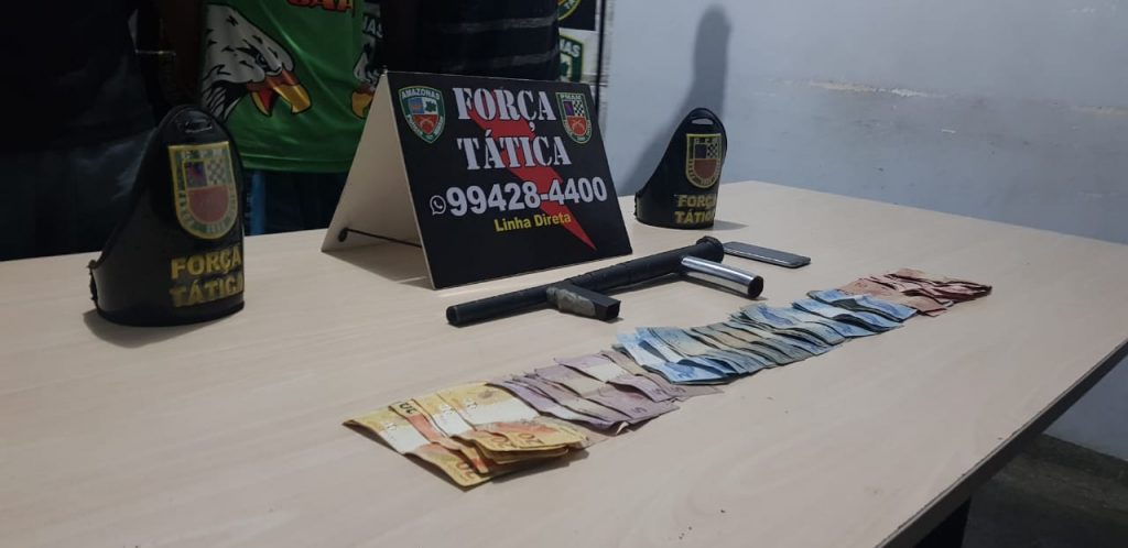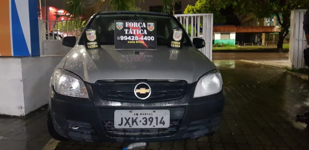 Com eles, além do veículo roubado, a Força Tática apreendeu uma arma caseira, um celular Samsung de cor preta e R$481 em espécie.