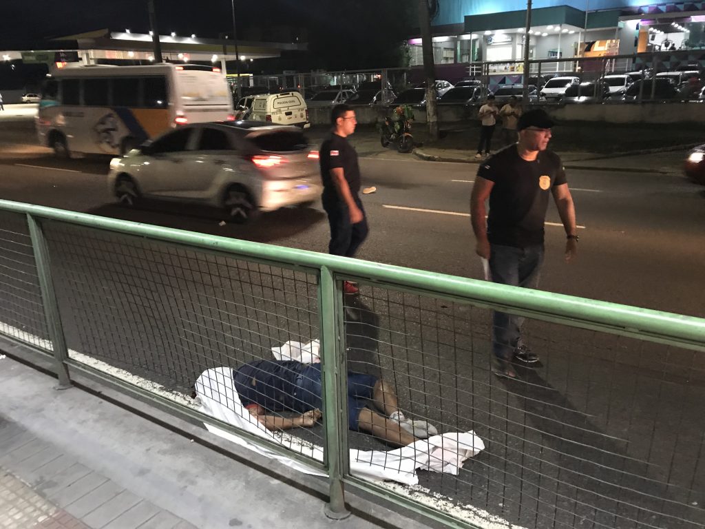 A vítima trajava uma bermuda jeans, camisa azul e sapato azul com listra branca. O corpo foi removido e encaminhado para o Instituto Médico Legal (IML), para os procedimentos cabíveis.