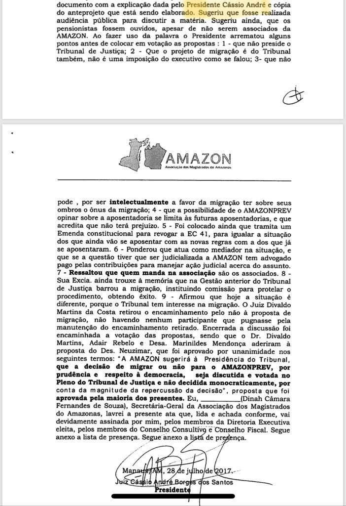 A reunião citada pelo conselheiro do CNJ foi uma assembleia realizada pela Amazon no dia 28 de julho de 2017, cuja Ata foi encaminhada à direção do TJAM em forma de Ofício (Ofício 63/2017 de 4 de Agosto de 2017) cujo texto do que o presidente da Amazon, durante Assembleia Geral Extraordinária (da associação) que “o projeto de migração é do Tribunal também, não uma imposição do Executivo (como se falou na assembléia)” e “que não pode, por ser intelectualmente a favor da migração ter sobre seus ombros o ônus da migração”, diz o Ofício.