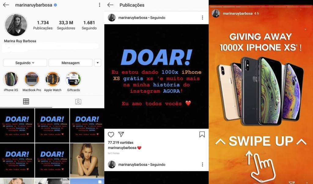 “DOAR! Eu estou dando 1000x iPhone XS grátis xs ‘e muito mais na minha história do instagram AGORA! Eu amo todos vocês”, diz a mensagem publicada na linha do tempo da atriz.