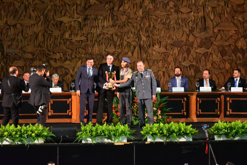 Experiência incrível – Uma das alunas que participou da Olimpíada Internacional Matemática Sem Fronteiras, Eloísa Amaral, recebeu um troféu das mãos de Bolsonaro e estava emocionada. “Foi uma experiência incrível e muito gratificante por trazer esse troféu para casa e fico muito feliz por ser dessa equipe espetacular, por estar representando nosso colégio, nosso estado e nosso país. Foi uma honra gigantesca para todos nós, estamos todos emocionados”, afirmou.