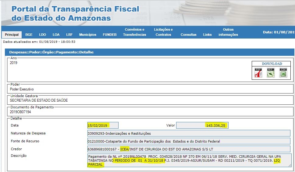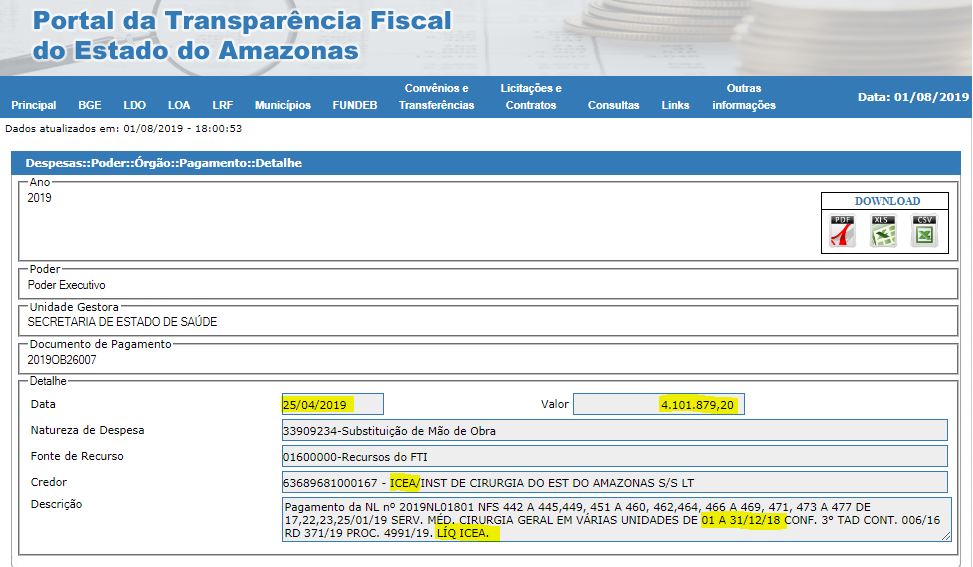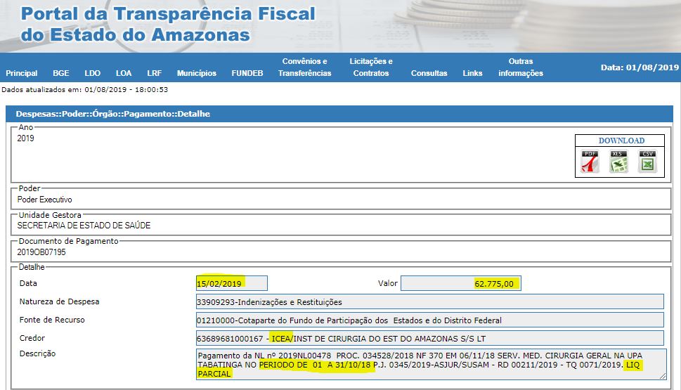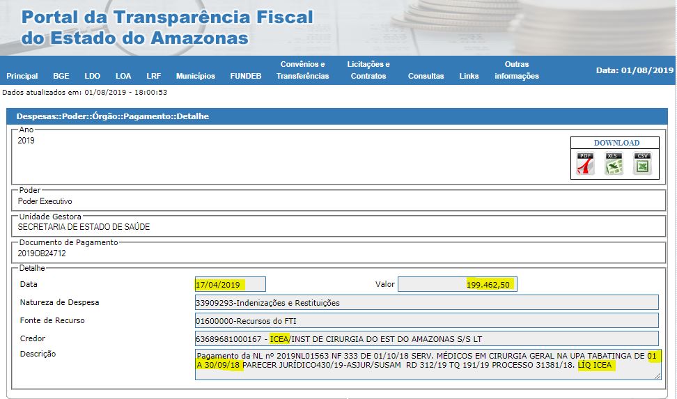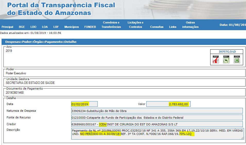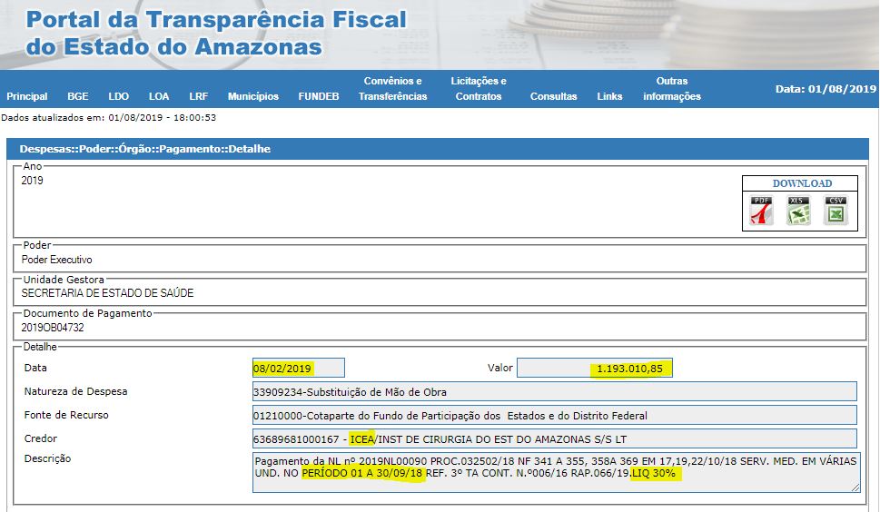 O Governo do Estado ainda pagou ao Icea duas competências do ano passado referentes a serviços prestados na Upa Tabatinga. A competência de outubro foi paga em duas parcelas – em 15 de fevereiro de 2019 foram pagos R$ 62.775,00 e mais R$ 143.336,25. Já a competência de setembro, no valor de R$ 199.462,50, saiu em 17 de abril de 2019.