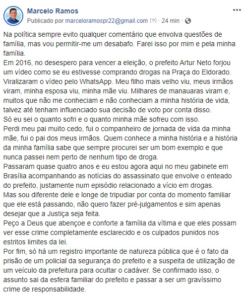 “Por fim, só há um registro importante de natureza pública que é o fato da prisão de um policial da segurança do prefeito e a suspeita de utilização de um veículo da prefeitura para ocultar o cadáver (de Flávio). Se confirmado isso, o assunto sai da esfera familiar do prefeito e passa a ser um gravíssimo crime de responsabilidade.”, concluiu Ramos em nota.