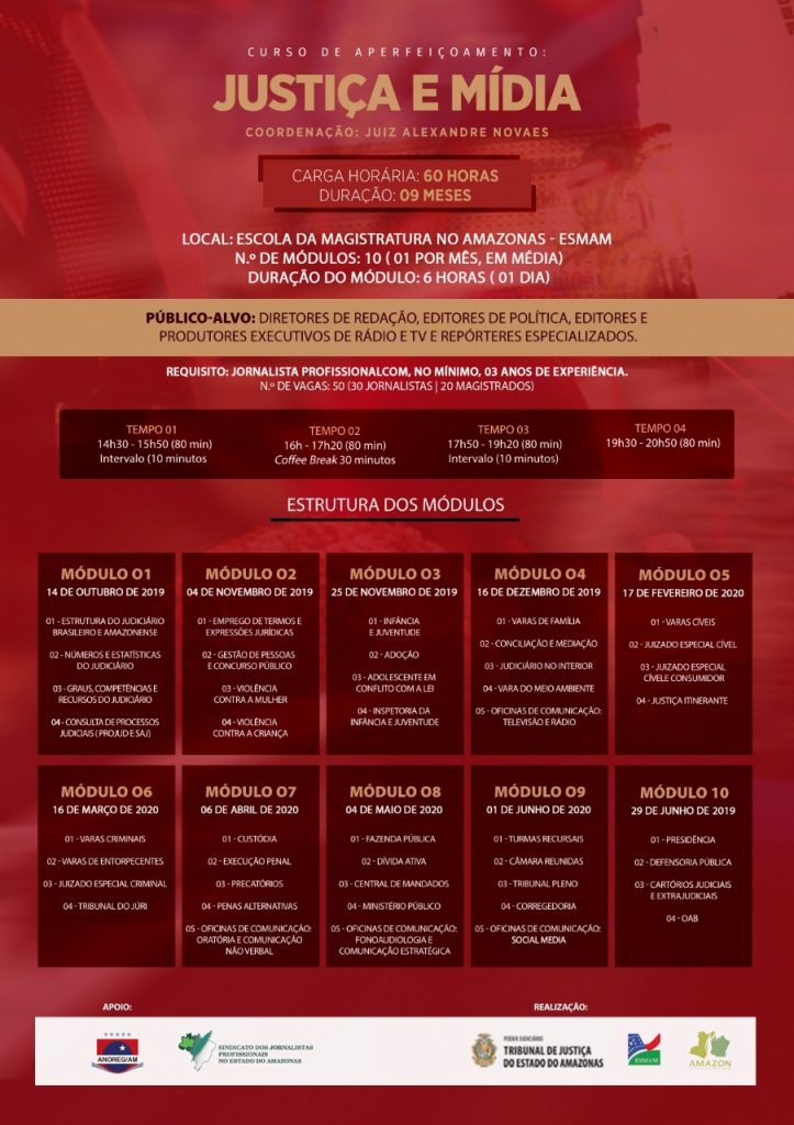 Para a primeira turma, foram convidados 30 jornalistas de diversos canais de Rádio, TV, Jornal e Internet, que representam todos os meios de comunicação com atuação no Estado do Amazonas. Em cada módulo eles poderão trocar experiências, tirar dúvidas e conhecer um pouco mais sobre o trabalho do Judiciário com quatro palestras, ministradas por magistrados e servidores selecionados de a acordo com sua área de atuação no Sistema de Justiça.