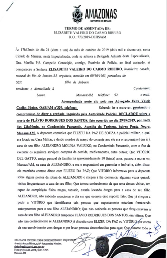 Manaus – Am | Nessa segunda- feira (21/10) a primeira – dama Elisabeth Valeiko prestou depoimento na Delegacia Especializada em Homicídios e Sequestros (DEHS), sobre o caso Flávio Rodrigues, encontrada morto dia 30/09/19, em um terreno baldio .