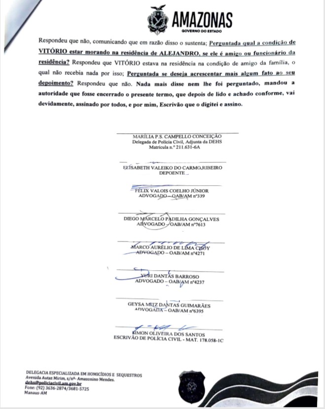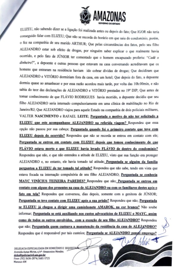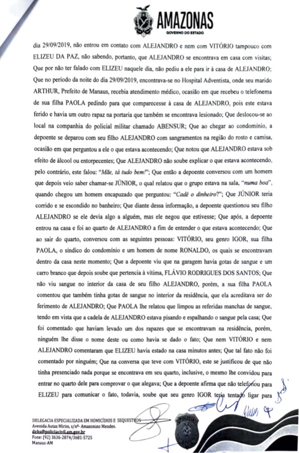 No período, dia 29/09/19, encontrava-se no Hospital Adventista, onde o seu marido Arthur Neto, prefeito de Manaus, recebia atendimentos médicos. Ao receber um telefonema de sua filha Paola pedindo que fosse até a casa de Alejandro, pois ele estava ferido e outro rapaz machucado.