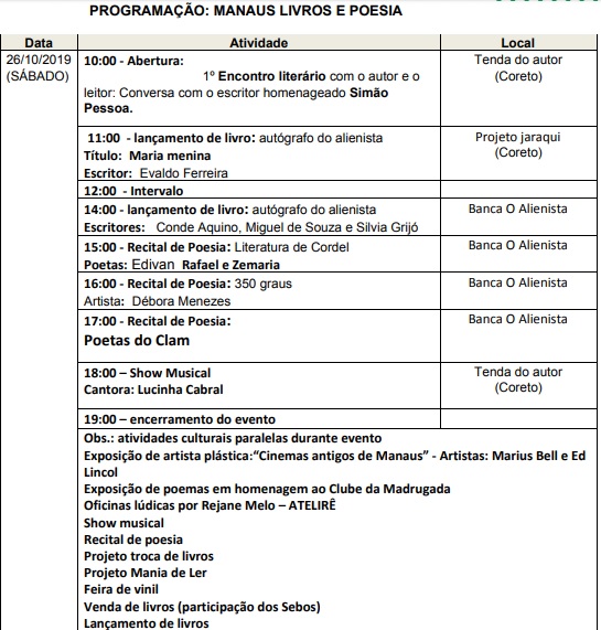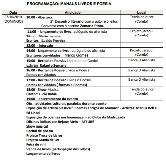 Evento 1º Manaus Livros & Poesia acontece especialmente de 26 a 31 de outubro, datas que celebram aniversário de Manaus e dia da poesia, respectivamente