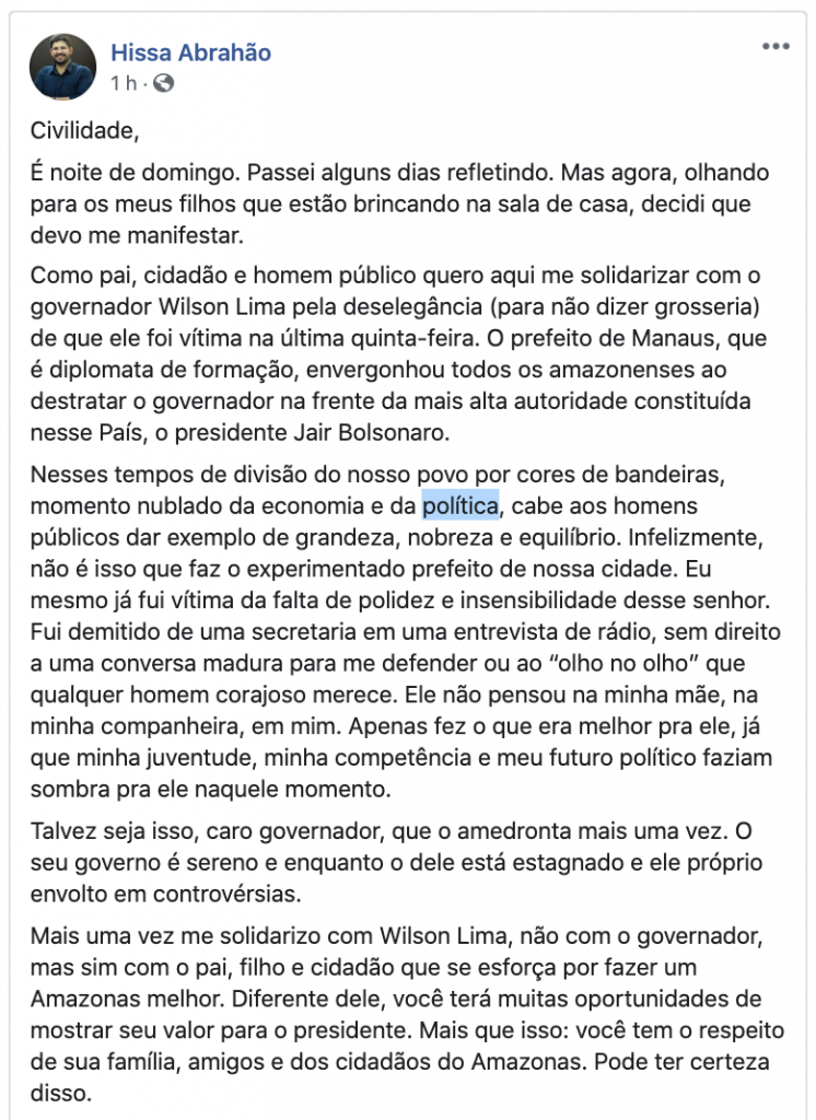 A postura de Arthur também foi avaliada por políticos locais. Na noite deste domingo (01), o presidente do PDT Amazonas, o ex-deputado Federal Hissa Abraão, classificou o episódio como deselegante e grosseiro. Em sua postagem nas Redes Sociais ele lembrou que também foi alvo do que ele classifica como “falta de polidez” do prefeito de Manaus. Em um dos trechos do texto ele lembra “Fui demitido de uma secretaria em uma entrevista de Rádio”.