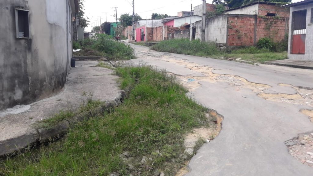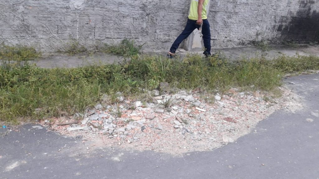 Durante a nossa live, flagramos um morador colocando cascalhos na rua para tentar amenizar a situação. “Nosso bairro está esquecido, o mato está dominando as calçadas e pra compensar, as ruas estão só buracos”, disse.