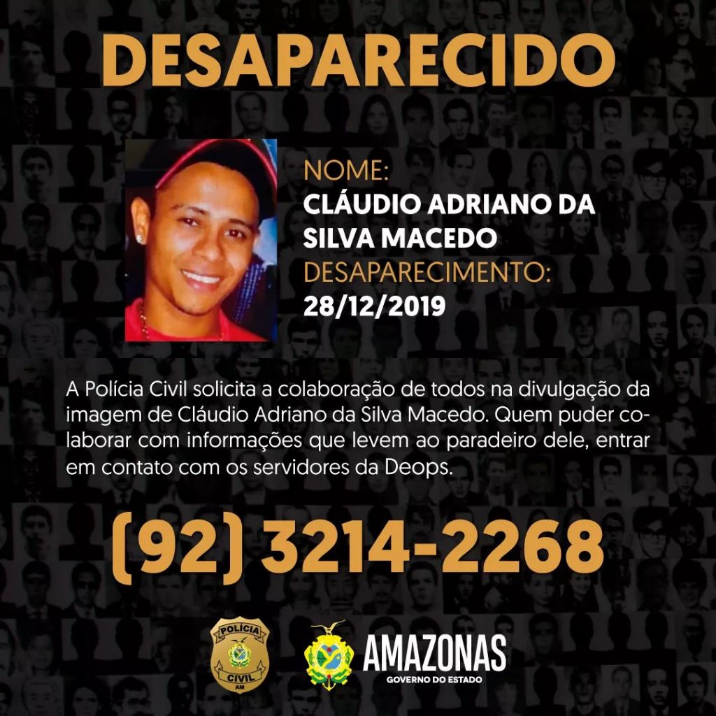 Se você souber informações sobre Cláudio Adriano, informar para a polícia pelo número (92) 3214-2268.