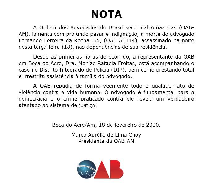 Segue a nota da Organização dos Advogados do Brasil do Amazonas (OAB-AM), emitida sobre o caso: