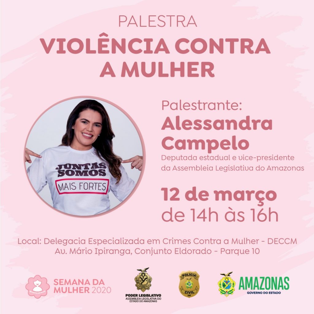 Ainda conforme José Alberto do Valle, a segunda palestra será ministrada pela deputada estadual Alessandra Campêlo (MDB), na próxima quarta-feira (12/03), das 14h às 16h, no prédio da Delegacia Especializada em Crimes contra a Mulher (DECCM), situada na rua Recife, conjunto Eldorado, bairro Parque Dez de Novembro, zona centro-sul de Manaus.“As palestras terão duração de duas horas e serão direcionadas ao público em geral.