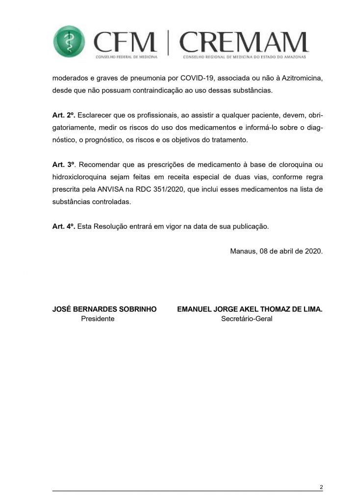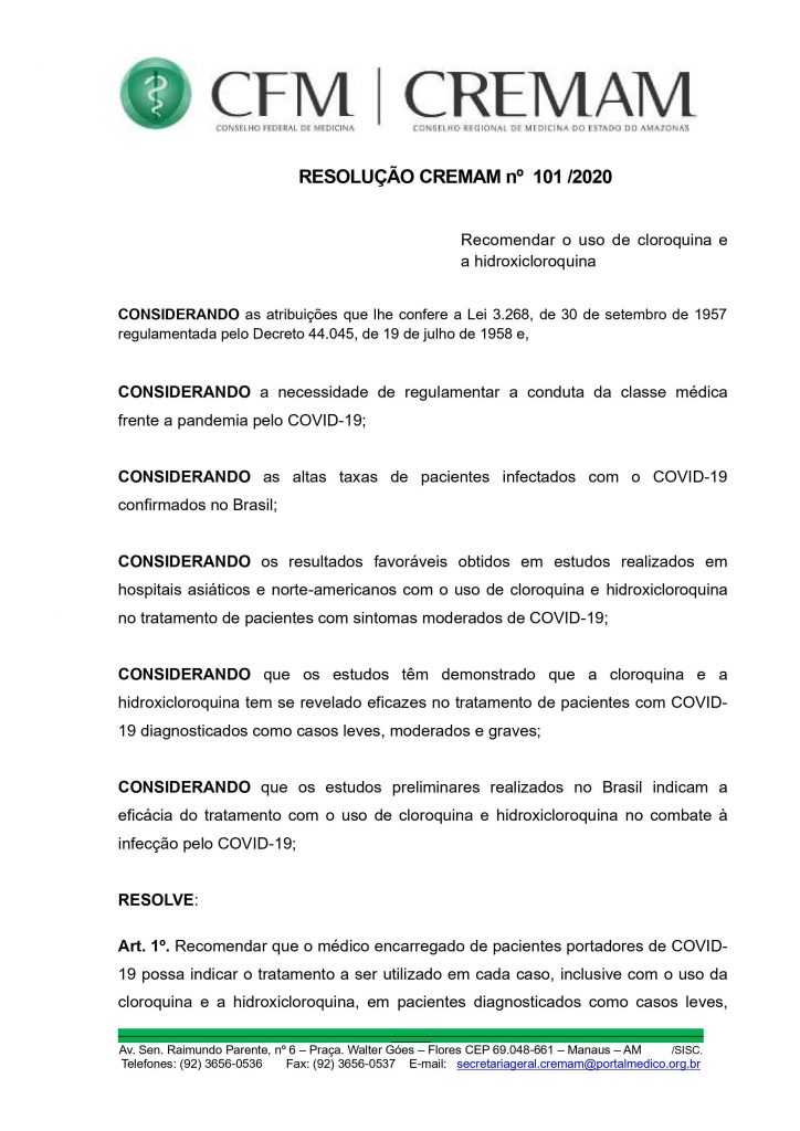 O conselho considera resultados favoráveis obtidos em estudos realizados em hospitais asiáticos e norte americanos com o uso da cloroquina e hidroxicloroquina para tratar pacientes com com sintomas moderados de Covid-19. Considera, ainda, que os estudos preliminares realizados no Brasil indicam a eficácia do tratamento com o uso dos medicamentos no combate à infecção pelo coronavírus.