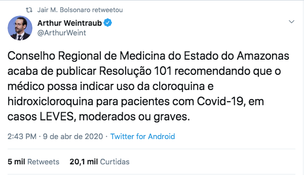 Na tarde desta quinta-feira, o assessor especial do presidência da república, Arthur Weintraub, anunciou que o CREAM havia publicado a portaria com a orientação aos médicos.