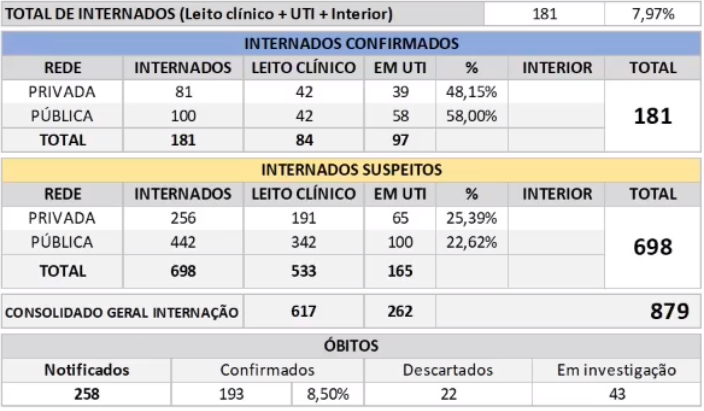 Do total, 79,7% dos casos, ao todo 1809, estão em Manaus, com 163 óbitos. Já no interior, 20% dos casos, sendo 461 infectados e 30 óbitos. De ontem (segunda-feira, 20) pra hoje (terça-feira, 21) foram 8 novos óbitos, ao todo 193 óbitos no Amazonas.