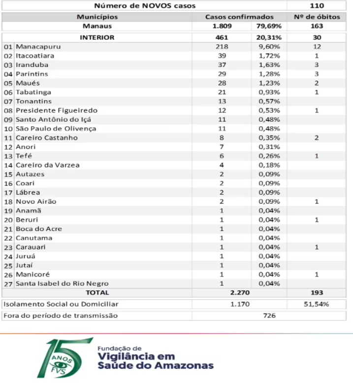 Manaus – AM | Nesta terça (21), o Amazonas registrou mais 110 casos de Covid-19, totalizando 2270 casos confirmados do novo coronavírus no estado, segundo boletim da Fundação de Vigilância em Saúde (FVS-AM).