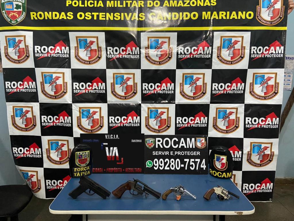 Durante revista pessoal, os policiais apreenderam dois revólveres calibre 32, um revólver calibre 38, uma arma de fabricação caseira calibre 22 e a quantia de R$ 11 mil em espécie.