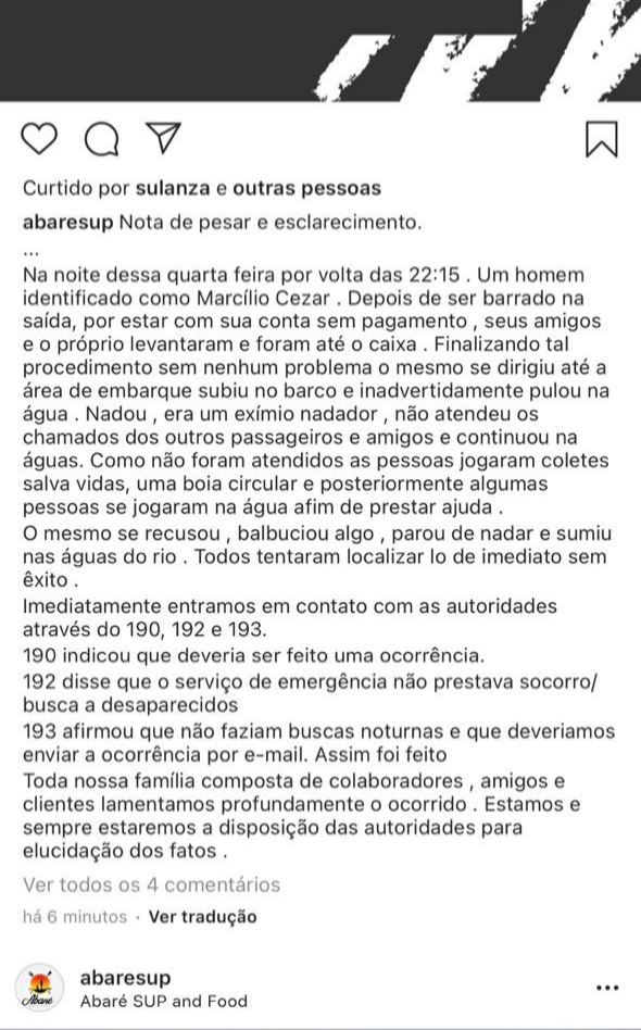 Natural do Rio de Janeiro, o homem estava desaparecido desde a noite dessa quarta-feira (23), quando estava no flutuante e se atirou no rio após momentos de diversão com amigos, como é possível ver em imagem de câmera de segurança.
