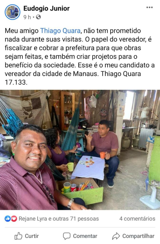 Thiago Quara está como candidato a vereador da cidade de Manaus, no número 17.133 e tem o apoio do amigo Eudogio Gonçalves. Juntos, sabem que a luta não é fácil por conta de pessoas que desacreditam na política. Mas, mesmo assim, reforçam que a única opção de mudar e acabar com a corrupção é pela democracia, é com o voto.