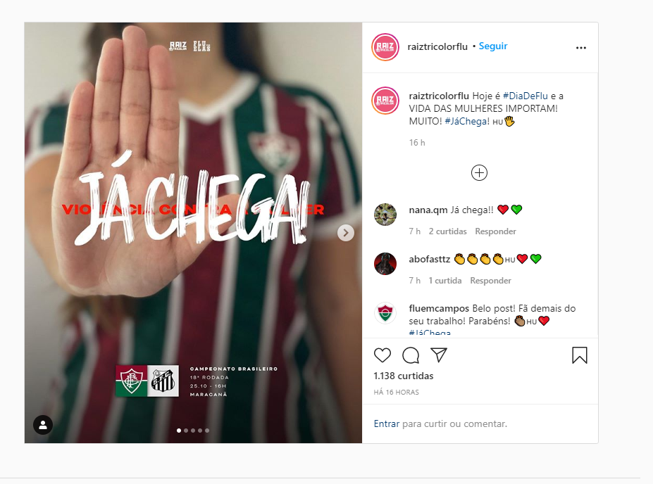 “O time de todos é contra alguns. Gostaríamos de reiterar que nos colocamos contra qualquer tipo de violência contra a mulher. No país que registra um caso de feminicídio a cada 7 horas, não podemos naturalizar o seguimento normal da vida de agressores, estupradores e assassinos. Que estejamos aqui por menos Cucas, Robinhos, Brunos, Jeans e Wesleys – diz a publicação que traz ainda recortes de manchetes recentes sobre o assunto”, postou na legenda.