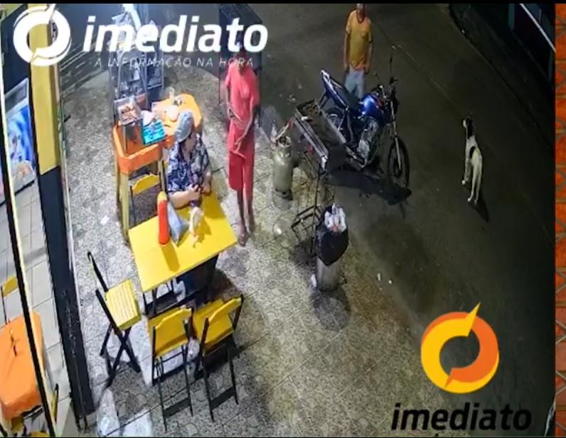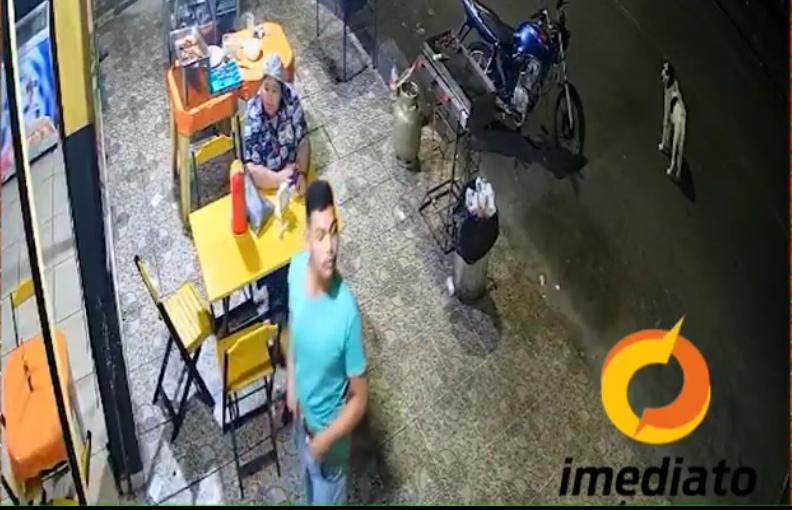 Câmeras de segurança mostram o momento em que a dupla chega no estabelecimento, a pé. O primeiro, de camisa vermelha, já chega pegando o celular de uma funcionária que está em frente ao estabelecimento. O de verde, manda o entregador entrar para o lanche.