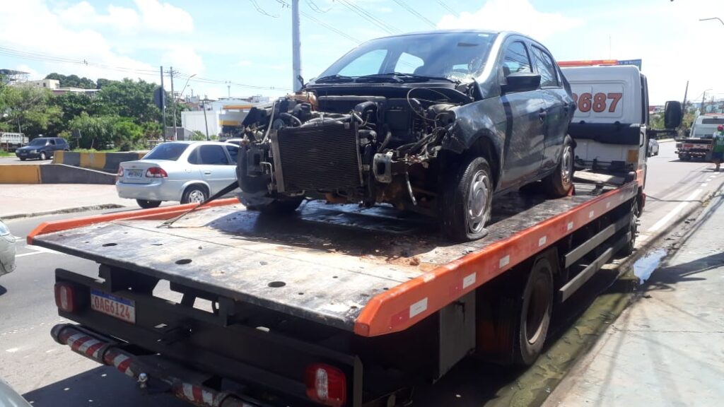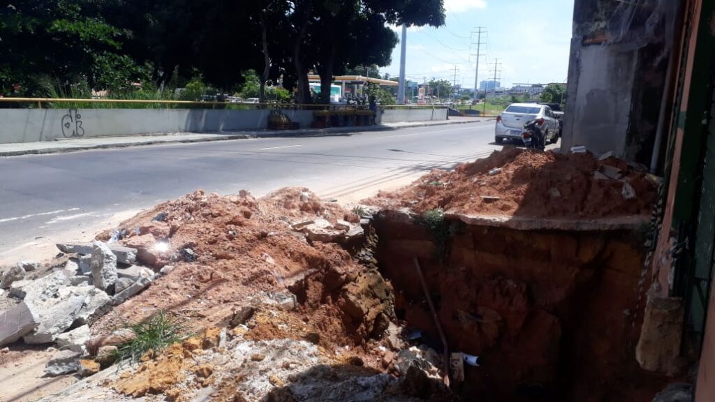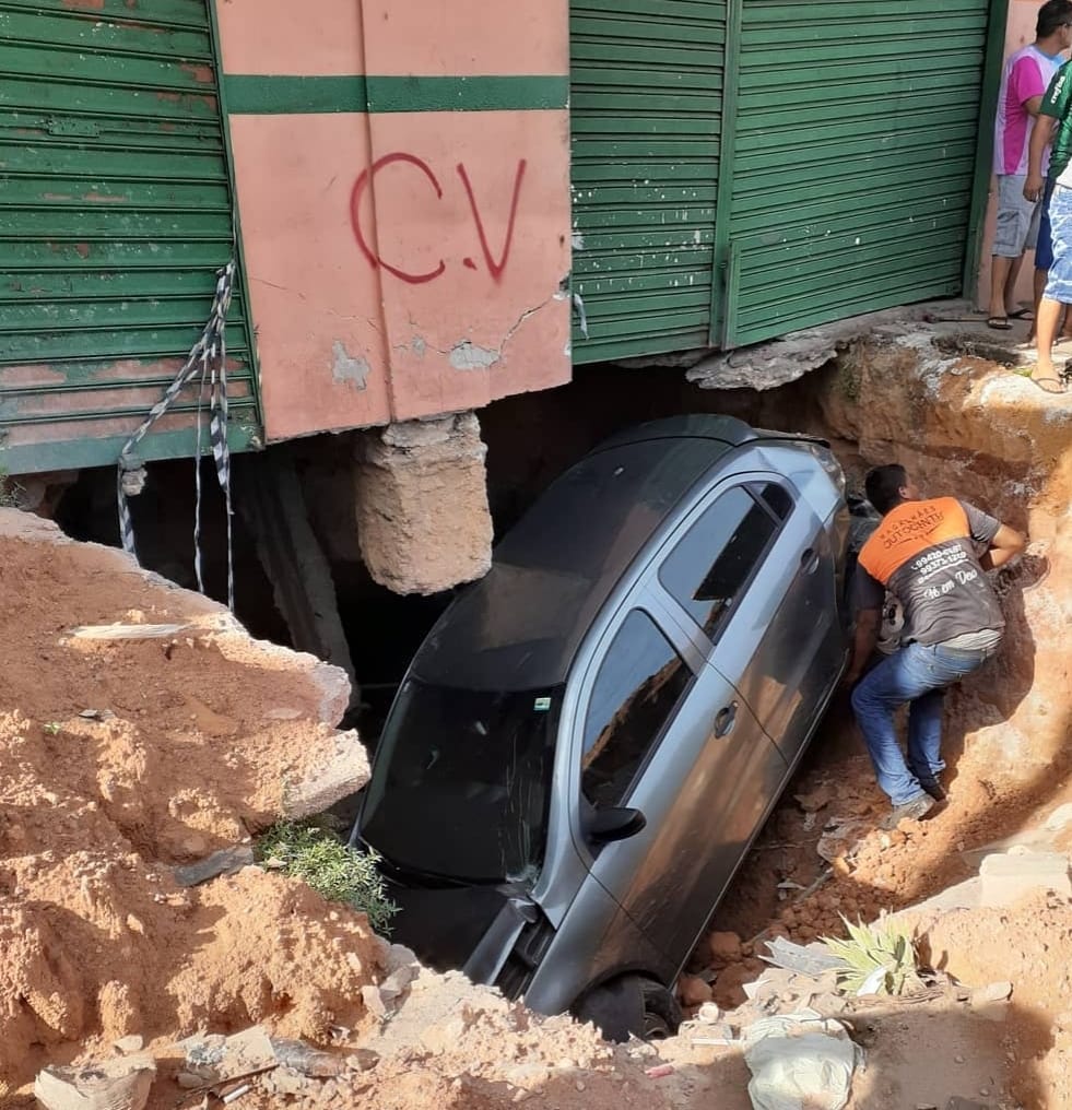 Manaus-AM | Um carro que estava estacionado próximo a uma cratera gigantesca na avenida Brasil, bairro Santo Antônio na zona Oeste, acabou sendo empurarrado e foi parar dentro do buraco durante a madrugada desta sexta-feira (20).