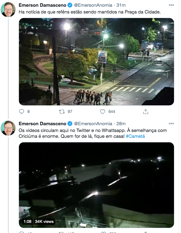 “Ta acontecendo um assalto nesse momento em uma cidade do interior do Pará chamada Cametá. Tem mais de 20 homens encapuzados, fortemente armados com fuzis, escopetas e afins. Tem mais de 50 reféns. Vocês deram importância pra Criciúma, dêem importância pra Cametá tbm”, diz a mensagem.