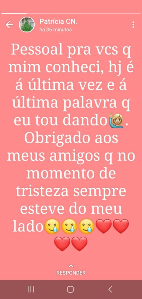 Após esse último contato a menor não deu mais notícias por meio de mensagens, e, no dia seguinte (9), a mesma realizou uma última postagem no stories do seu whatsapp, como uma espécie de despedida, o que deixou a família em desespero. “Pessoal pra vocês que me conhecem, hoje é a última vez e a última palavra que estou dando. Obrigado aos meus amigos que no momento de tristeza sempre estiveram ao meu lado”, dizia a mensagem. Confira: