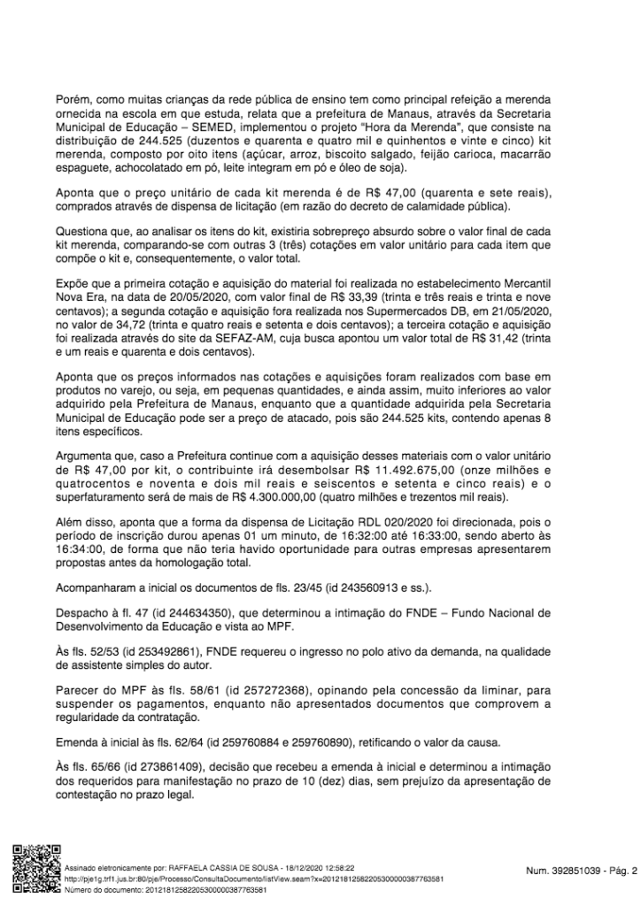 A prefeitura pagou um total de R$11,4 milhões pelos 244.255 kit, com suspeitas de que o superfaturamento foi de R$4,3 milhões no total, segundo o autor da denúncia. Esses alimentos foram entregues nos meses de abril a julho para alunos de rede pública municipal, durante o pico da pandemia do novo coronavírus em Manaus.