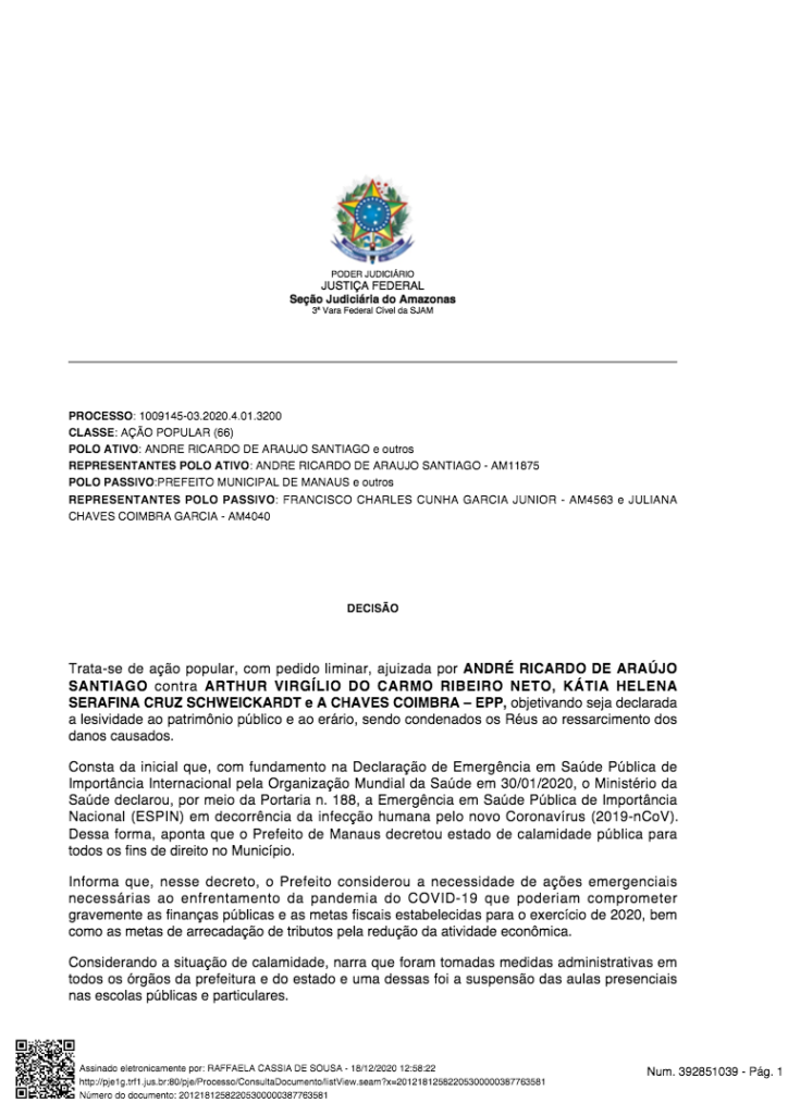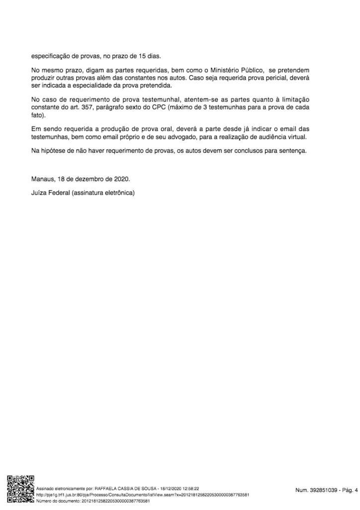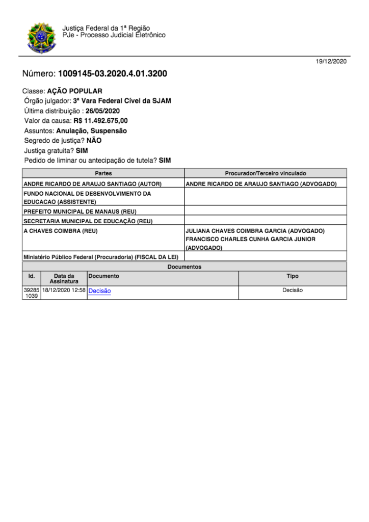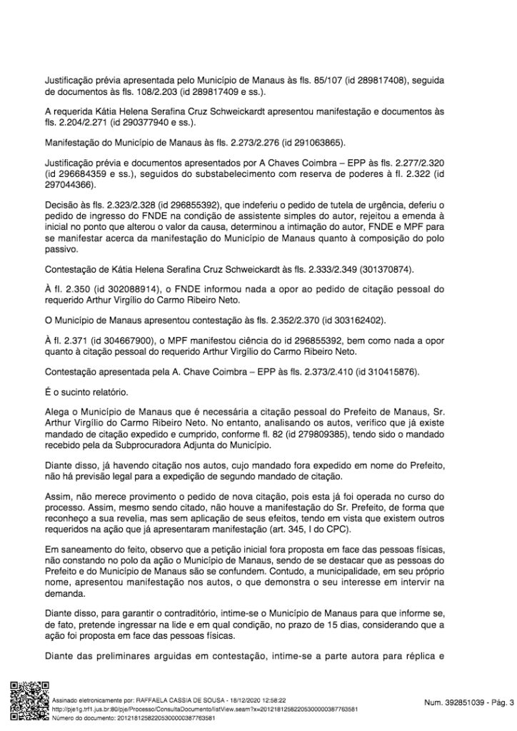 O processo que ainda está em andamento na Justiça Federal da 1 Região. Na última sexta-feira (18), a juíza federal Raffaela Cássia de Souza, da 3 Vara Cível, emitiu uma decisão cobrando posicionamento da Prefeitura de Manaus sobre a denúncia, pois, o prefeito Arthur Virgílio Neto é citado como um dos acusados.