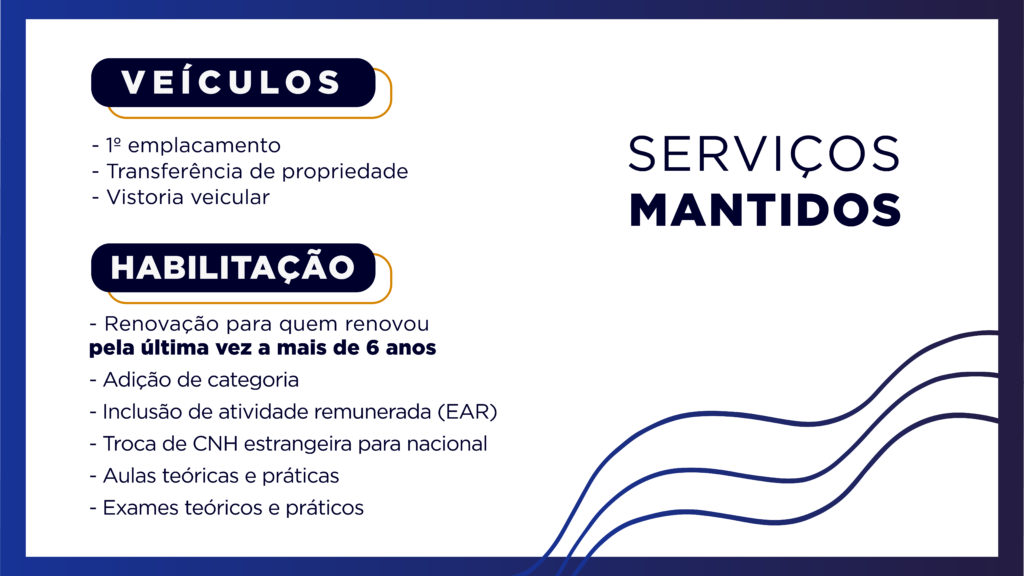 Serviços mantidos – Os demais serviços de veículos e de CNH serão mantidos, inclusive as aulas teóricas e práticas dos Centros de Formação de Condutores (CFCs), havendo apenas uma redução na capacidade de atendimento.