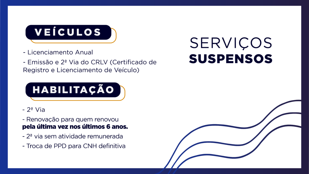A restrição nos atendimentos também afeta o serviço de segunda via da Carteira Nacional de Habilitação sem adição de Atividade Remunerada (EAR), troca de CNH Provisória (PPD) para definitiva, e renovação da CNH para aquelas pessoas que renovaram pela última vez nos últimos seis anos. Para esses casos, os agendamentos também serão cancelados.