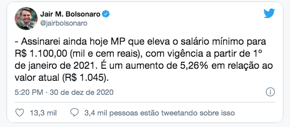 Em meados de dezembro, o Congresso havia aprovado a Lei de Diretrizes Orçamentárias (LDO) para 2021, fixando o salário-mínimo em R$ 1.088. Na proposta aprovada pelos parlamentares, não houve aumento real no salário, tendo sido feita apenas a correção com base na previsão da inflação acumulada no ano, de acordo com o Índice Nacional de Preços ao Consumidor (INPC).