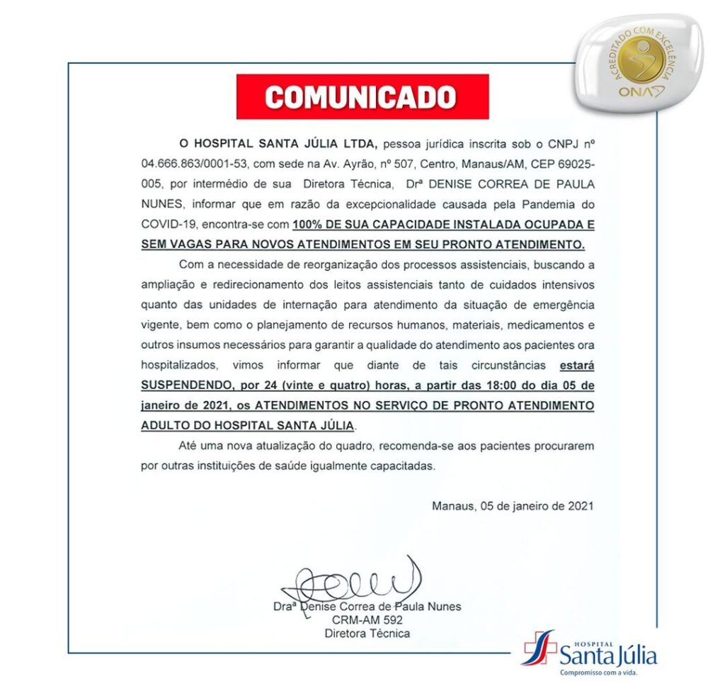 Hospital da rede privada de Manaus suspende atendimentos por lotação devido ao aumento de casos de Covid-19 no Amazonas.