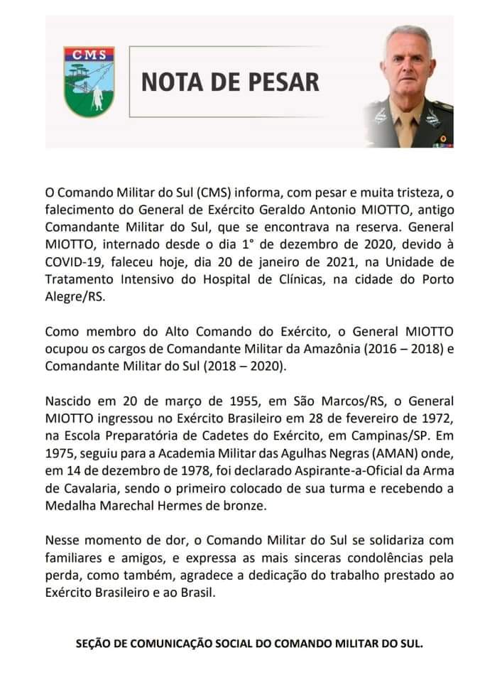 O Comando Militar do Sul (CMS) informa, com pesar e muita tristeza, o falecimento do General de Exército Geraldo Antônio Miotto, antigo Comandante Militar do Sul, que se encontrava na reserva. General Miotto, internado desde o dia 1º de Dezembro de 2020, devido a Covid-19, faleceu hoje, dia 20 de Janeiro de 2021, na Unidade de Tratamento Intensivo do Hospital de Clínicas, na cidade de Porto Alegre/RS.