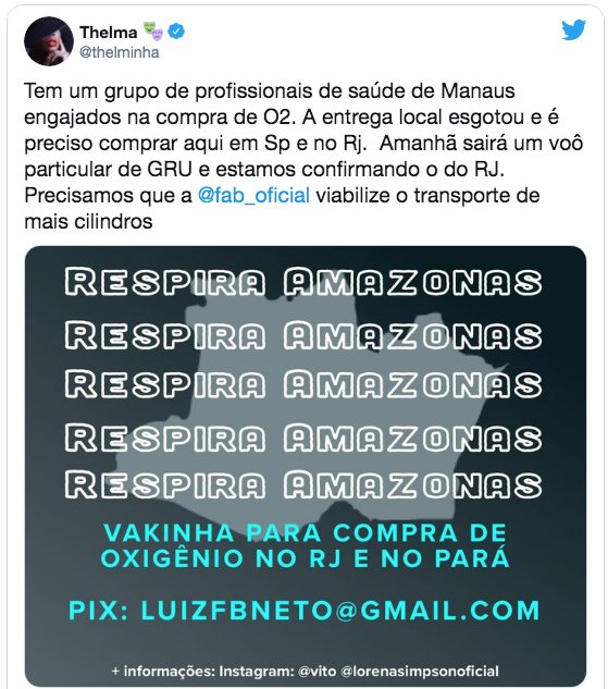 Por meio da Assessoria, a médica afirmou que optou vir para a capital “para dar todo o suporte necessário como médica nos hospitais”. Thelma já vinha se engajando na campanha “Respira Amazonas” desde as primeiras notícias da situação do Estado, que passa por mais uma colapso no sistema de saúde por conta do avanço da Covid-19. Ela também ajudou diretamente em campanha de arrecadação de cilindros de oxigênio e insumos.