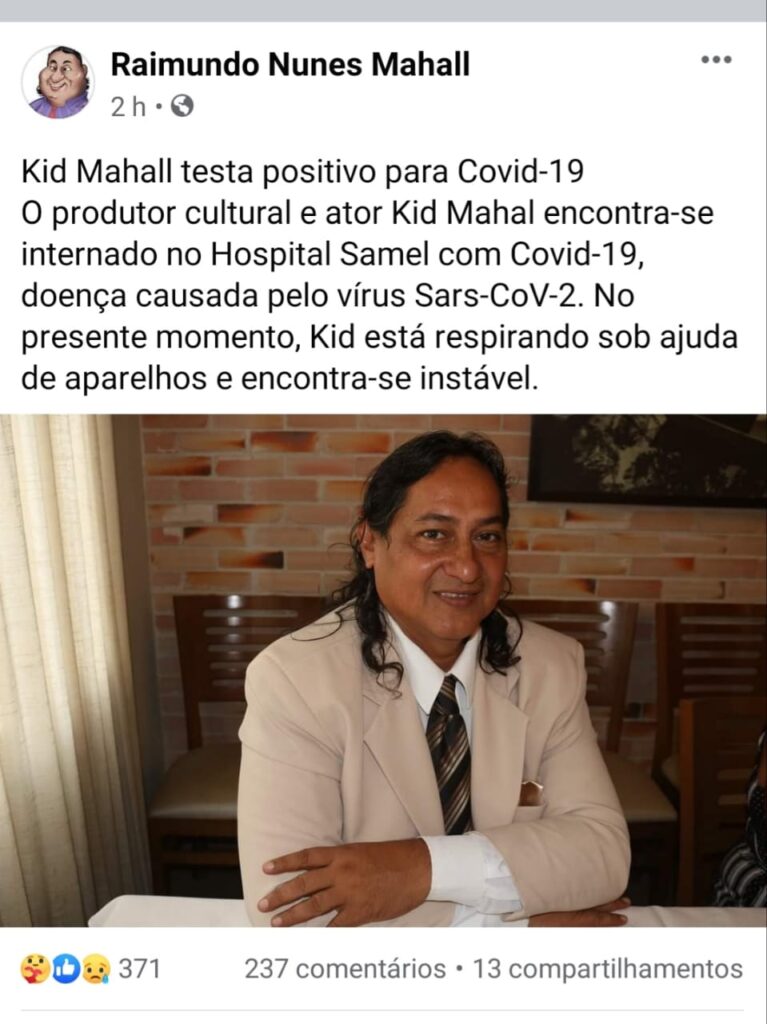 MANAUS-AM | Na tarde desta quinta-feira (21), em um comunicado na conta oficial do produtor cultural e ator Kid Mahall, foi informado que o ator testou positivo para Covid-19. O comunicado ressalta, ainda, que Mahall está internado no Hospital Samel, respirando sob ajuda e aparelhos e o que quadro de saúde do ator é instável.