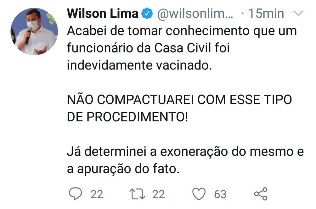 MANAUS-AM| Na tarde desta segunda-feira (25), o Governador do Estado do Amazonas, Wilson Lima, se manifestou nas redes sociais após ter conhecimento que um dos funcionários da Casa Civil foi vacinado, passando à frente do grupo prioritário.