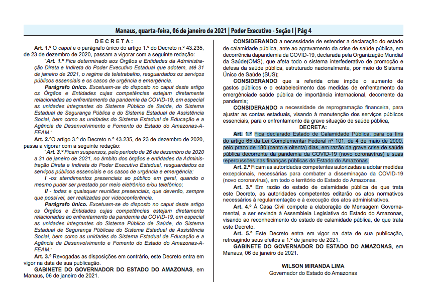 Neste ano (2021), o governador do Amazonas, Wilson Lima, prorrogou por mais 180 dias (seis meses) a situação de calamidade pública em todo o Estado, por conta do avanço da Covid-19, que voltou a lotar hospitais e cemitérios na capital. A prorrogação foi publicada no Diário Oficial do Estado de quarta-feira (06/01). Confira:
