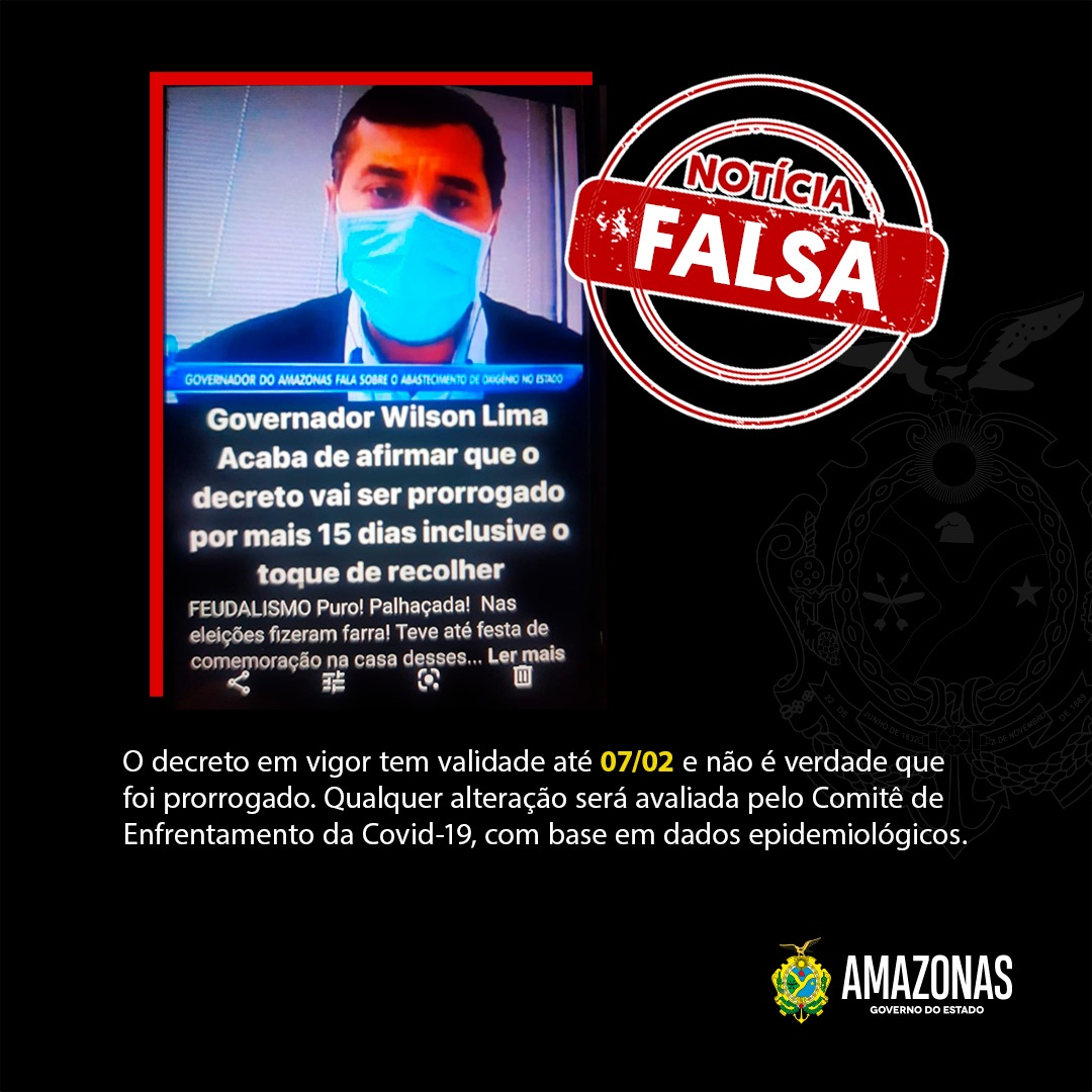 MANAUS-AM| Na manhã desta quinta-feira (04), mais uma fake news circulou nas redes sociais, afirmando que o Governador do Estado teria prorrogado o decreto que restringe a circulação de pessoas no Amazonas por mais 15 dias.