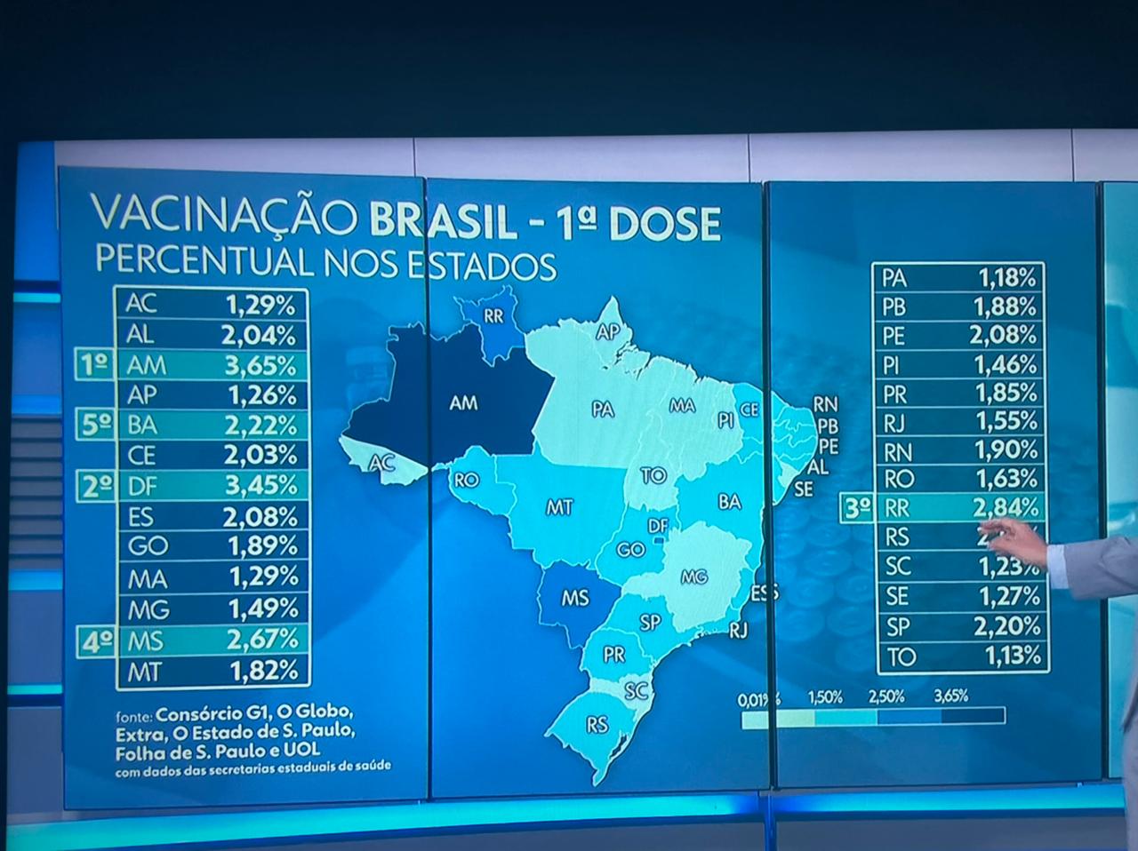 Para o comparativo, o consórcio avalia dados do Amazonas que são repassados pela Fundação de Vigilância em Saúde (FVS). Com as mais de 153 mil doses aplicadas da primeira dose, o estado já imunizou contra a Covid-19 o total de 3,65% da população. Logo atrás vem o DF, que imunizou 3,45% de sua população com a primeira dose.