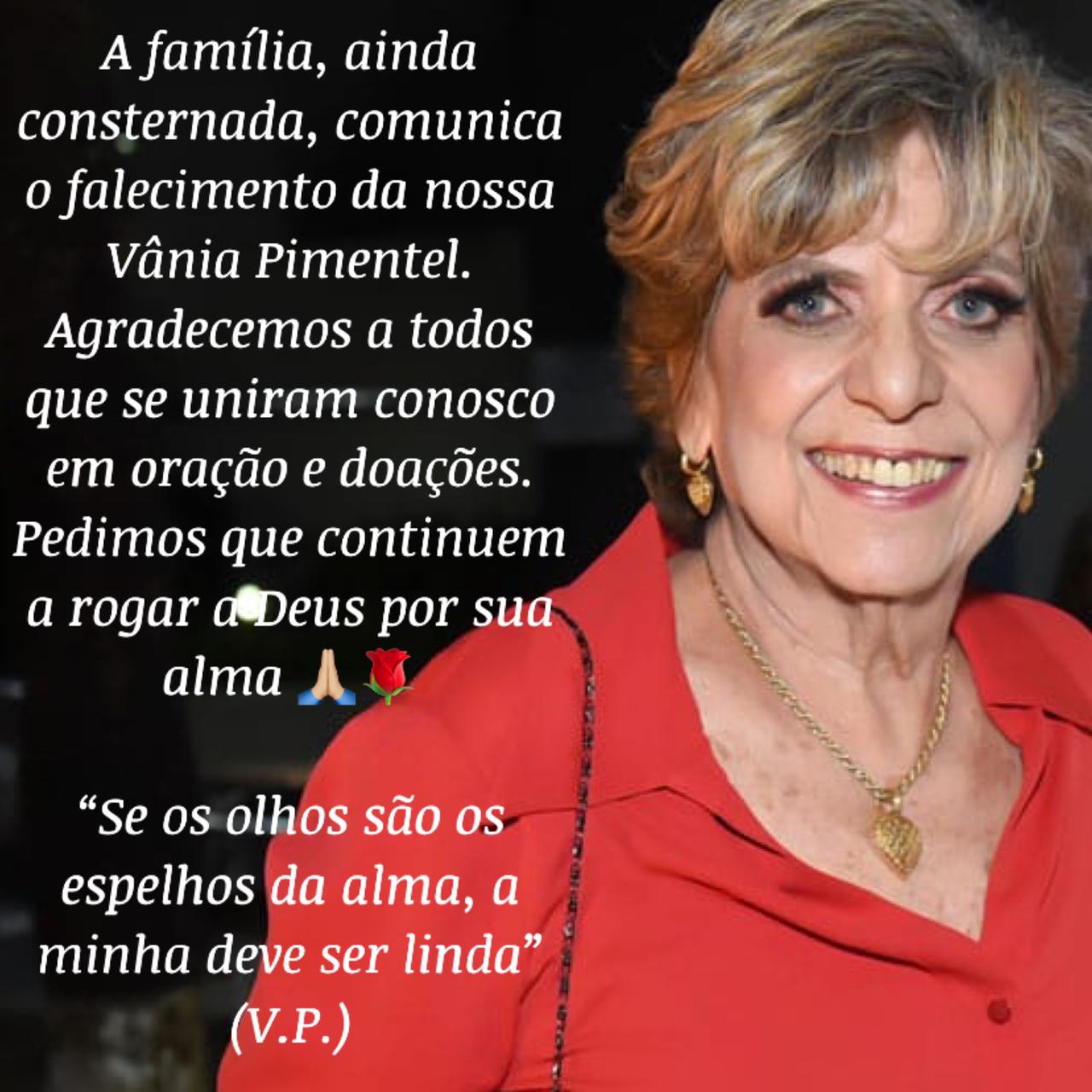 “Queridíssima educadora de várias gerações, a professora Vânia Pimentel iniciou, hoje, a viagem de volta à casa do Pai Eterno! Só tenho a agradecer tudo que aprendi, como minha mestra de Redação Jurídica, com essa mulher inteligente! Brilhante! Meus aplausos, Vânia! Você será lembrada! Mais uma vítima da covid-19. Um grande abalo no meu coração!”, dizia uma das homenagens.