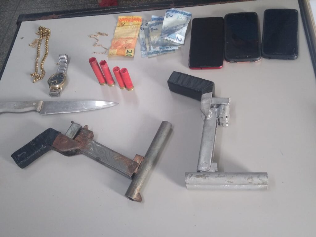 Foram apreendidos duas armas de fogo caseiras, uma faca, quatro munições/cartuchos, sendo duas deflagradas, além de um cordão, pulseira, um relógio e R$ 30,00, em espécie.