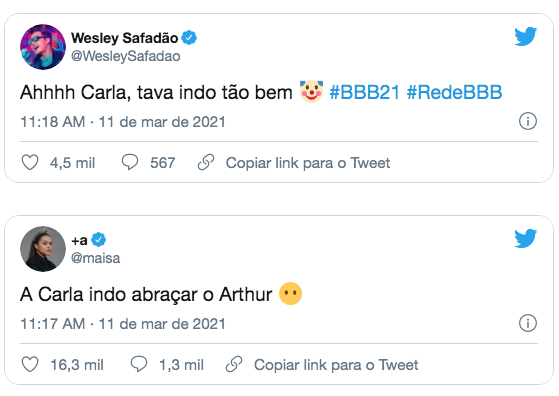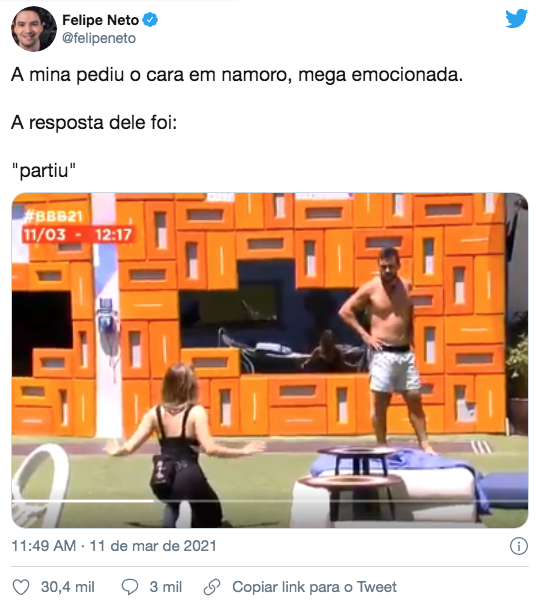 A cena virou piada também com o comentário de Felipe Neto sobre o “pedido de namoro” feito por Carla Diaz a Arthur.