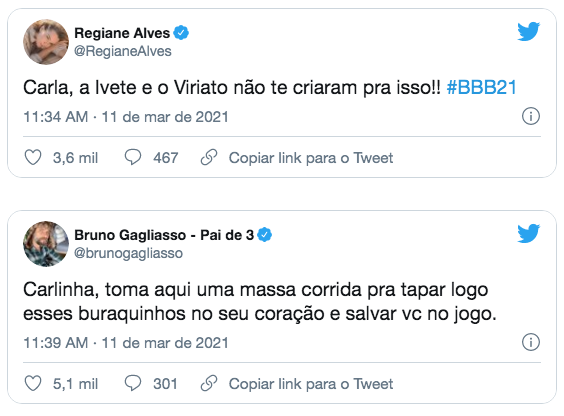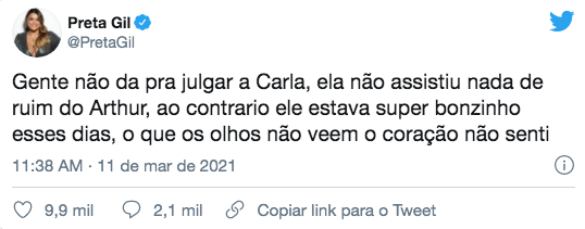 Já a Preta Gil entrou em defesa da sister, afirmando que ela não teve a oportunidade de assistir as mesmas cenas que os telespectadores.