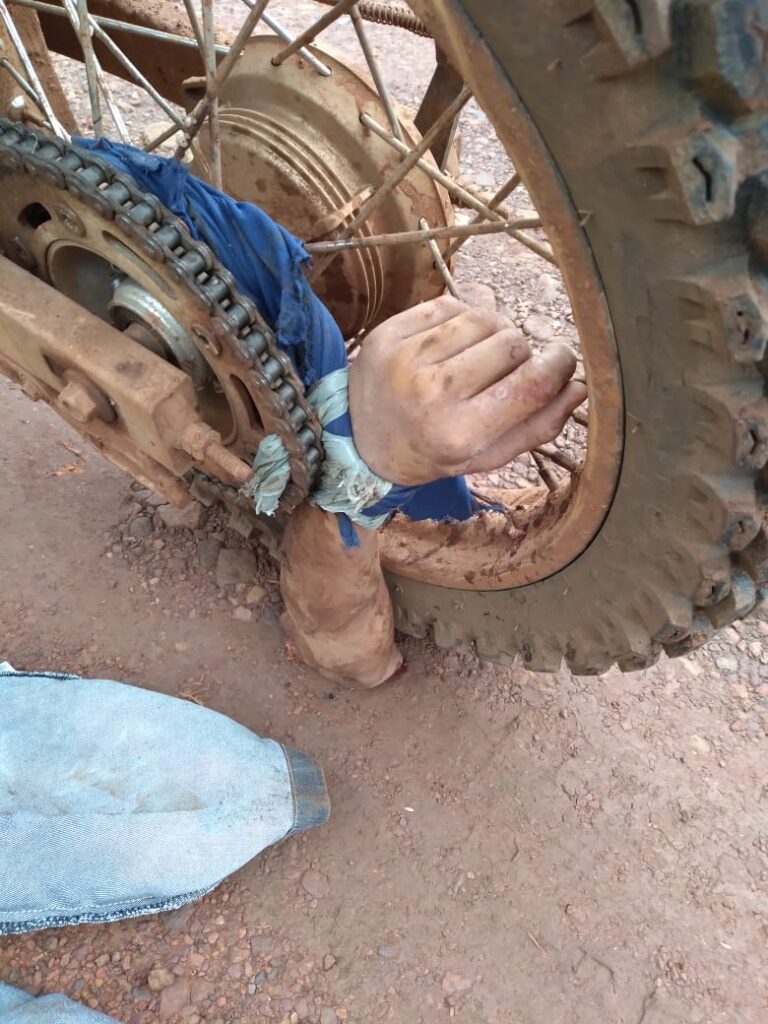 Testemunhas que presenciaram o ocorrido relataram que a criança estava na garupa de uma motocicleta, segurando uma camisa, quando o tecido se enrostou na coroa do veículo. Com a rotação do pneu, a camisa foi puxada e o braço do menino foi arrancado.